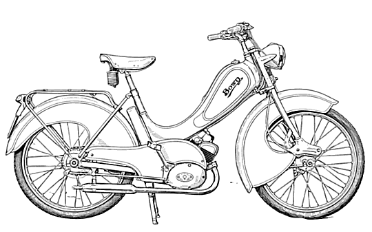 For a short time before they closed in the 1970’s, Petty’s stocked a few French mopeds as complete machines, which were essentially heavy duty pushbikes with a small 2-Stroke motor, similar to the Trojan, suspended or the front wheel. (This may have coincided with the closure of the Velocette works in Hall Green, Birmingham, for which Petty’s had been a main dealer.) Drive was again via a serrated roller, this time bearing on the front tyre. One of the few front wheel drive motorcycles perhaps?