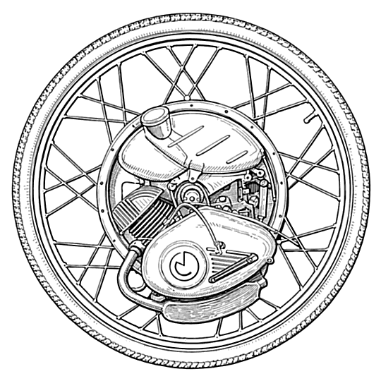 With some modification the Cyclemaster unit could be fitted to any standard adult bicycle frame. Usually the rear forks of the standard bike frame had to be forcibly widened at its extremities to accommodate the wider Cyclemaster rear wheel. The fatter tyre on the Cyclemaster might also create problems with chafing if incorrectly aligned. BSA made their own version which they named “The Winged Wheel”. All in all the Cyclemaster was an uncomplicated, compact, and well thought through design which provided off-the-peg get-to-work motorized transport for a relatively small outlay.