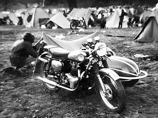 I can see us now arriving at the gate on a smouldering Ariel combo looking like we had come from Scotland (er Chester actually) having lost the silencer and the sidecar door, both run over by a following wagon driven by an irate trucker who had had enough of doing 25mph. The clutch was slipping and dragging something terrible. I can't remember how many times we stopped to let everything cool down. In desperation we put soil in the clutch as someone had remembered reading about Fullers Earth as a temporary fix! It seemed to work for a while.