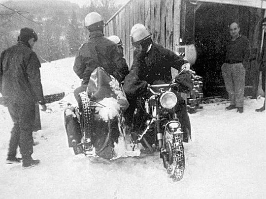 Millevaches 1969 - Four on Michel Perdrix’s combo sidecar; heavy loads preferred for extra grip in the snow.