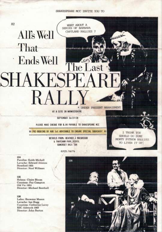 SHAKESPEARE INVITE YOU TO All's Well That Ends Well The Last* SHAKESPEARE RALLY *UNDER PRESENT MANAGEMENT AT A SITE IN WARWICKSHIRE SEPTEMBER 27/27/28 PLEASE MAKE CHEQUE FOR 8.00 PAYABLE TO SHAKESPEARE MCC PRE-BOOKING BY AUG 1st ADVISABLE TO ENSURE A SPECIAL SOUVENIR DETAILS FROM: HEATHER MACGREGOR WHAT ABOUT SERIES OF BARBARA CARTLAND RALLIES? 124 Parolles; Keith Michell Lavache: Edward Atienza Stratford 1955 Director: Noel Willman 125 Helena: Claire Bloom Countess: Fay Compton Old Vic 1953 Director: Miehael Benthall 126 Lafeu: Brewster Mason Lavache: Ian Hogg Countess; Catherine Lacey RSC Aldwych 1968 Director: John Barton I THINK YOU SHOULD DO SOME MONTY PYTHON RALLIES TO LIVEN IT UP!