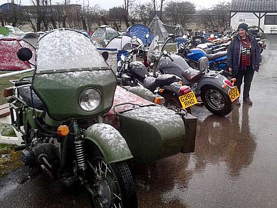 Never trust April weather. The previous weekend we had done the Vintage Club's Felix Burke navigational scatter, all around the Cotswolds in beautiful sunshine on the Beetroot, our BMW outfit. This weekend we had taken our summer tent but fortunately our winter sleeping bags. This was the first rally we took Heather's new BMW R9t to that year and it snowed! (I was ok though as I was riding the Beetroot)