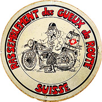 Left: The commemorative sticker of the 1st Gueux d'Route Suisse rally organized by Alain Chauvet, Jean-Claude Golay and Pierre Fontannaz near Yverdon.