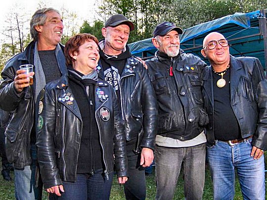 Gueux d’Route 2013 – This rally, initiated by Patrick Servanton (the secretary of the association), and organized in Sarlat, Dordogne, brought together 33 years later, all the former pirates, Gueux d’Route, and subscribers of the magazine; immortalized by the press during this unique event (from l. to r.): Herve Bully (founder); Karine and Patrick Servanton (event organizers); Gerard Gauffier (founder); and yours truly (founder).