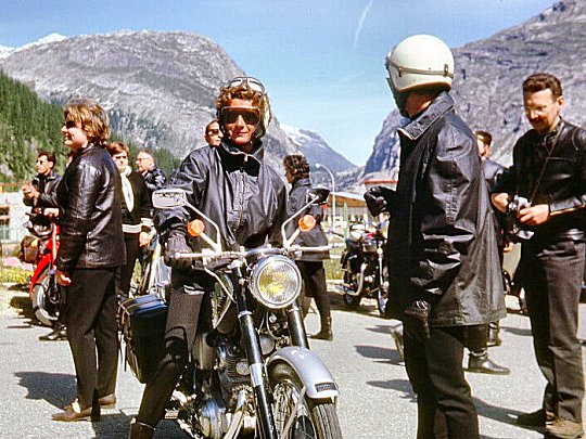 In conversation with Jean Murit (right), the initiator of this gathering. The rider to his left, wearing a helmet, is the Italian Mario Artusio, who would create the Stella Alpina rally the following year, 1966. Note the chamois horns ornamenting the top of the headlight.