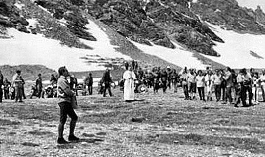 A speaker, armed with a portable loudspeaker, gathered everyone together for the blessing at around eleven-fifteen, which was delivered amid rapt attention. As the speaker repeatedly called out: “Marielle! Marielle!”, it became clear that Olympic champion Marielle Goitschel had left the snowy slopes of the Pissaillas glacier, just a few hundred metres away — where many skiers were enjoying their sport — to make an appearance at the Chamois.