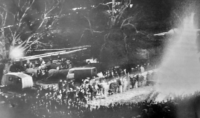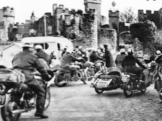 As the light faded from the winter sky the tempo at the castle speeded. Machines moved into formation for the headlight parade. Then, suddenly, the mutter of engines rose to a crescendo. Out of the trees emerged a succession of headlights their beams swathing into the darkness, a column of light, snaking up the mountain side. Far away, towards Llanberis, went the dot-dot-dot of pin-pointed rear lamps: an endless chain of light five miles long. That was an unforgettable display.