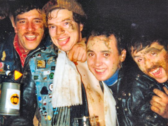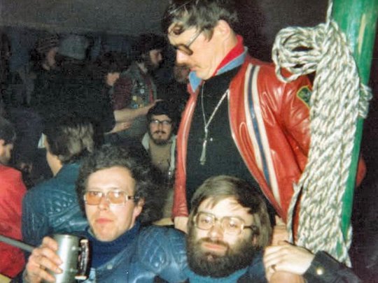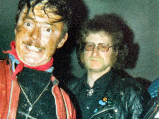 We took shelter in the large, muddy beer tent — although they only had cans, which had to be opened with a screwdriver! The rain was really lashing down by now when a dripping-wet Pete Lawton unexpectedly turned up, followed by an equally soaked Mike and Ian. They were laughing at the idiots who’d taken their bikes onto the field… not realising ours were parked right next to our tents.