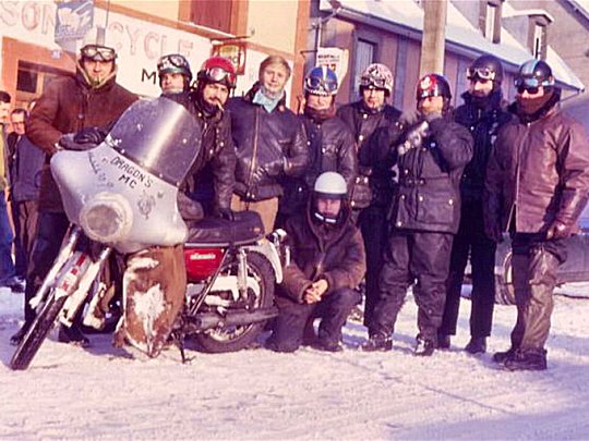 Millevaches 1969 - The Dragons MC delegation in the snowy hell. Cigarette in his mouth and red helmet, Kiki Blanchot, founder and leader of the club, with his men.