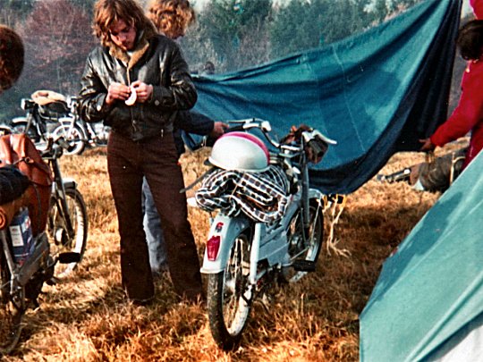 Millevaches 1972 - The moped has always been part of the landscape at this winter rally — here, a rider sticks the rally decal onto his trusty little steed.