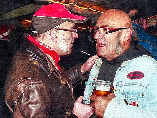 Millevaches 2014 – Two seasoned old-timers in conversation: (left) Philippe Frouin, aka ‘Belette,’ and (right) ‘Jojo’, member of the unforgettable Secte Motarde des Huns, de Bordeaux.