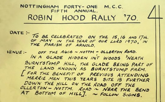 Visual records of this notable rally's early years, from the late 1960s to the early 1970s, are difficult to find. Our research, however, has recently unearthed an informative document: the header from the Nottingham 41 MCC's 1970 flyer for its fifth rally.