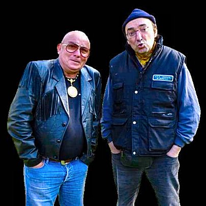 Yours truly (r.) here with Hervé Bully (l.). By sheer luck, when the brigadier lost it, I was out of his line of fire, watching the chaos — sky-blue shades, Elvis sideburns, and high as a kite. Dodging a beating that afternoon? Absolutely priceless.
