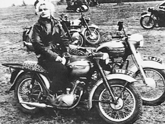 One can also notice on her bike the adoption of a swing-arm rear suspension — a major technical innovation introduced by Triumph in 1957 to replace the older rigid frame.