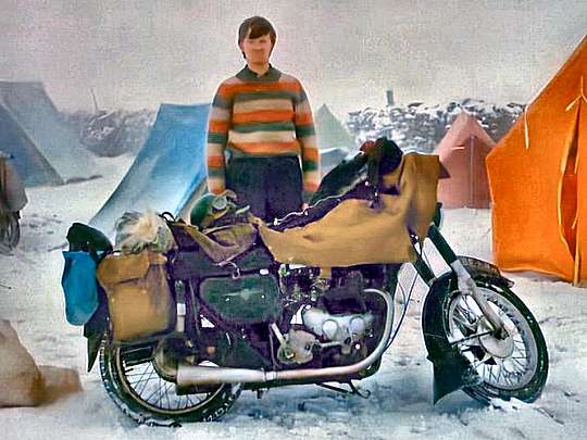Below, the same metal steed, but this time presenting its best side to the photographer, and ridden by Stefan its owner, whose attire, typical of that bygone era, gives him the air of a kind of modern-day knight, encased in his leather armor, seeming to have stepped straight out of a Miguel de Cervantes novel.
