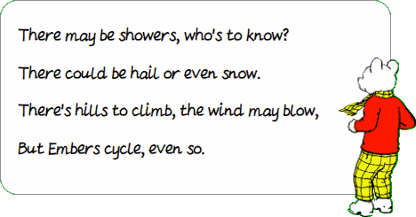 Our return route took us up a 10‑in‑13 hill, so designated because ten out of thirteen Embers had to walk up it. This week many Embers cycled miles between them.