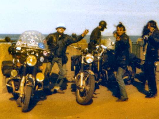 IOM 1977 - Left to right: Pierre Yves 'Bebert' Beranger (white hat) and his BMW R90S ; Serge 'Raspoutine' Vollard (black helmet) and his twin Triumph; and yours truly (pointing to the photographer) and his Commando. The girl on the right was 'Didou', my girlfriend at the time