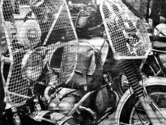 Raid Orion 1972 - Michel Mauve (left) and Michel Degaine (right) and Degaine BMW R50 serie 5 equipped for the track with its homemade protective grid supposed to protect against stones.