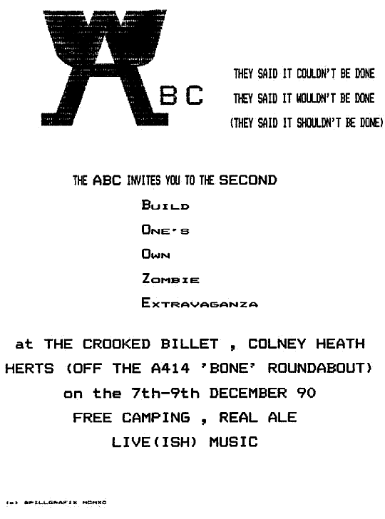 ABC They said it couldn't be done They said it wouldn't be done(They said it shouldn't be done) The ABC invites you to attent the second Built One's Own Zombie Extravaganza at the Crooked Billet, Colney Heath, Herts (off the A414 Bone Roundabout) on the 7th-9th December '90 Free Camping, Real Ale Live(ish) Music © SPILLGRAPHIX MCMXC