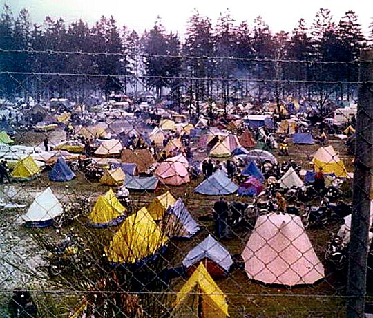This was . I don't have the original report to hand; all that remain are a few scraps of memory. It was cold but dry, we crossed the German border with some lads from Coventry, one of whom proceeded to goose-step up and down in front of bemused border guards. We were booked in at a gasthaus and I'd teased Annie that there might only be a single bedroom left. As we arrived the hausfrau apologised that there was only one room left so I passed an uncomfortable night on the floor. My only memory of the Elephant itself was that it didn't feel like the cosy rallies I was used too; it was too big, too crowded and simply overwhelming.