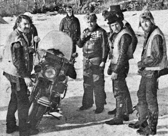 Kiki Blanchot (left), the notorious Jo Poterre (wearing the fur hat) from the HD Club de France. Behind him stand three prominent members of the MC Dragons: likely Jean-Claude “Grand Cowboy” Boyer (only his hat visible), and in front of him Jean “Le Plombier” Pozzo (black hat). I’m drawing a blank on the identity of the third.