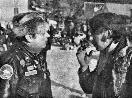Kiki, seen from the back, is deep in conversation with a Laverda guy. On his shoulders, his sheepskin cut-off shows the colours — club name up top, logo center, nickname below. Back then, it was the Dragons’ signature — their identity, their uniform.