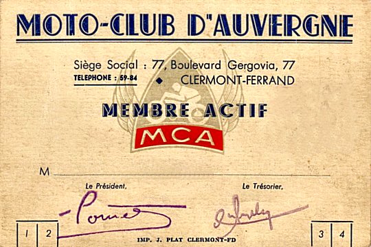 Founded in 1925, the Moto-Club d'Auvergne had its finest hours of glory between 1959 and 1974, as the centerpiece of the organization of ten French motorcycle Grands Prix which gave the Charade circuit its credentials. Note on this membership card the signature of its then president, Marcel Cornet.
