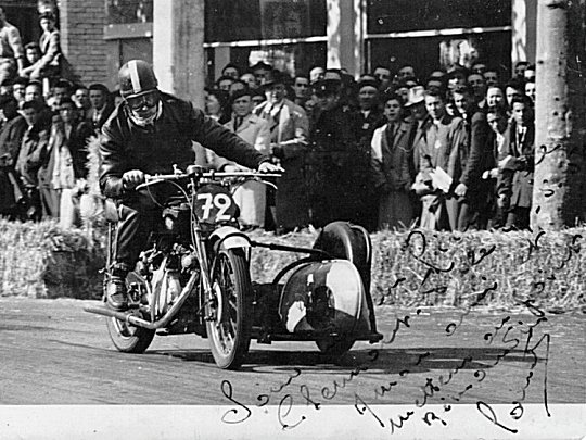 Rare autographed photo of Marcel Cornet racing on the handlebars of his Vincent, at the time when he was active in the sidecar category