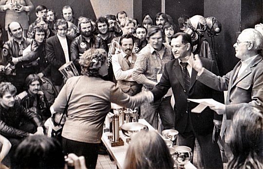 At the trophy presentation, Marcel Cornet in a suit and tie shaking the hand of a Belgian recipient; behind him Jean Delain (checked shirt); and the head of yours truly to the left of the head of Jean, in the background